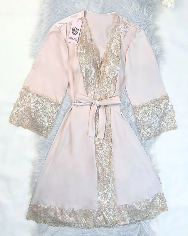 Conjunto de Camisola Amamentação com bojo e Robe Midi com Cinto, Renda Bicolor.
