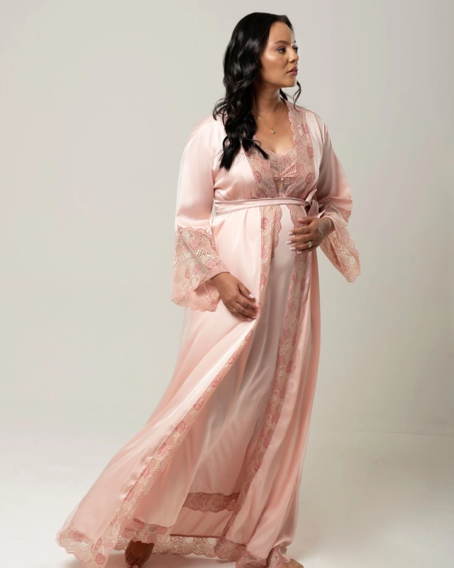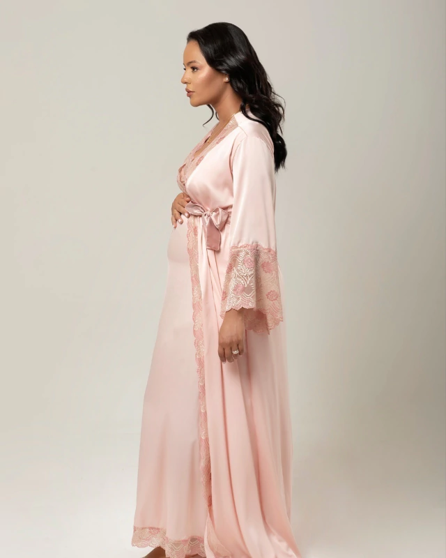 Para mais sofisticação e elegância as peças de camisola e robe tem acabamento na barra todo trabalhado em renda.