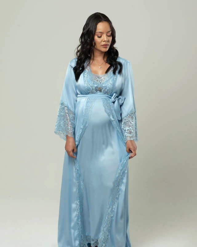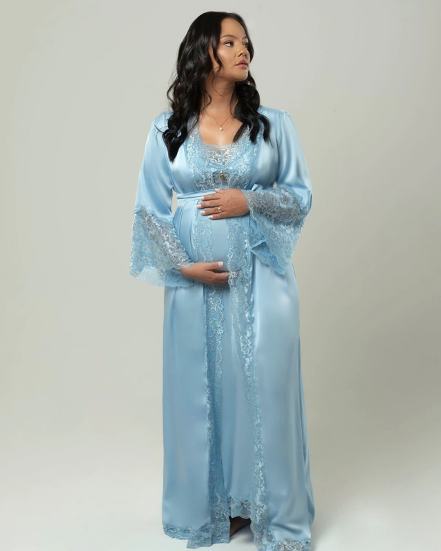 O Conjunto de Camisola Longa com Robe é a escolha perfeita para mamães que prezam por sofisticação, conforto e praticidade. Feito em cetim de alta qualidade com toque de seda, este conjunto oferece caimento impecável e sensação de leveza na pele, aliado a um design minimalista e elegante.