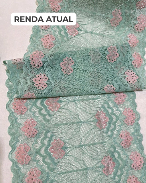 Cetim cor verde, com detalhes em renda bicolor verde com detalhes em rosé.
