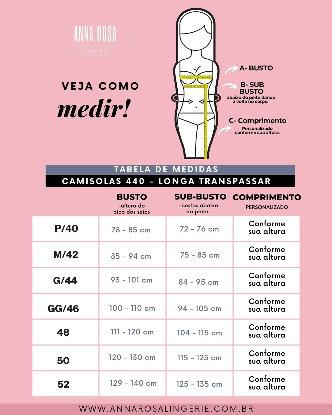 É indispensável o uso da tabela de medidas para garantir o ajuste perfeito. Desconsidere a altura da camisola na tabela, pois fazemos o ajuste personalizado conforme sua estatura.